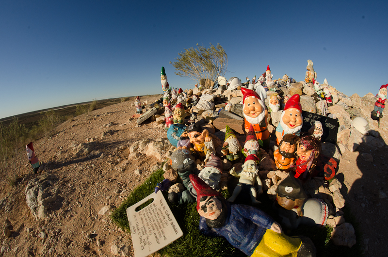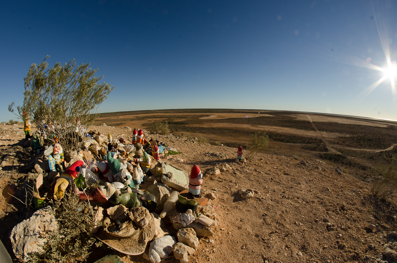 I don’t know how or why it started, but over the years travellers have been leaving garden gnomes and other figures at this scenic lookout, some with messages of remembrance for departed friends and family …..just one of the many roadside oddities you see while driving in Australia.