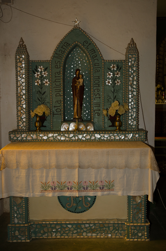 About 100kms from Broome, on the Dampier Peninsula, is Beagle Bay. At the Aboriginal community there is a church built by German missionaries in 1917, replacing one built in 1896 by French monks sent out as missionaries. During World War 1, instead of being interned the German missionaries were placed under house arrest so they could build the church. The building and altars are decorated with mother of pearl and shells from local beaches, in traditional Christian and local aboriginal motifs.