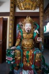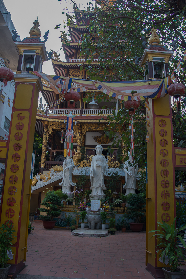 The signs were written in Laos and Vietnamese, the décor was rather garish in Chinese style and it was definitely a Buddhist temple so I assume it is a Vietnamese/chinese temple. There was a stairway leading to the upper levels, but it had a sign in Vietnamese which I guessed said “no entry’ so I only went up to the first level where the main altars were, guarded by a Chinese warrior rather than the usual Thai style figures.
