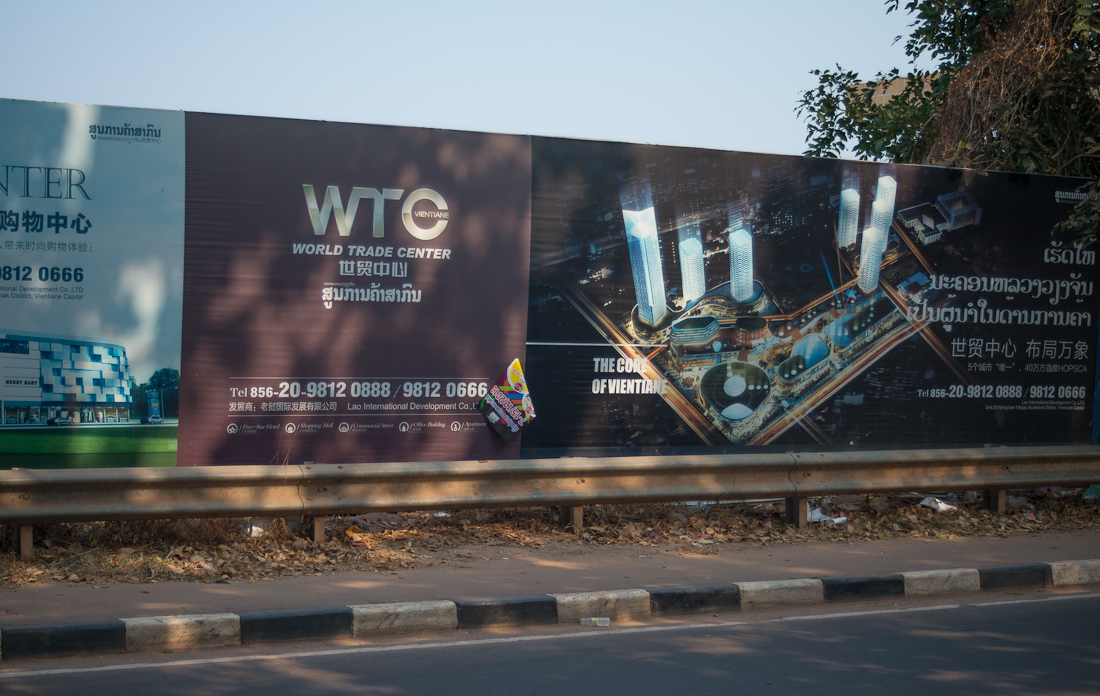 On the edge of Vientiane’s city centre is a large, very large, building site which apparently is going to be Vientiane’s “World Trade Center”, complete with skyscraper hotels, apartments and offices, shopping malls (with 7/11,starbucks, Versace, etc according to the artists impressions) and sports stadium. I just cannot imagine all this in laid-back Laos, but construction is under way so if you want to see Laos as it is now then best you get here in the next couple of years perhaps.