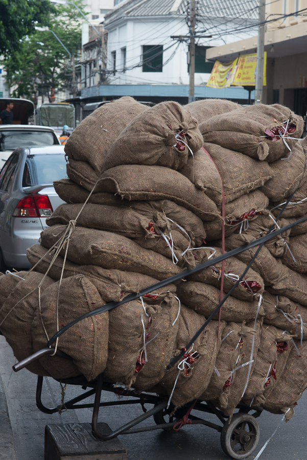 I went for a walk around Chinatown again the other day, it’s one of my favourite parts of this city. In some parts of Bangkok you can almost forget that you are in Asia, but not in Chinatown ! Every street, every little alleyway, has something to remind you of that, such as the little shopfront store selling nothing but sacks of dried red chilli. I could smell the place long before I saw this trolley-load of chilli parked out the front. My throat began to burn from the pungent smell just walking past the shop, from a very quick glance inside I guess there was about 200 large sacks of dried red chilli.