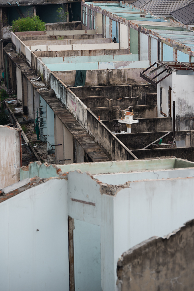 So it is with this row of shophouses at Phra Khanong Skytrain station, being demolished for yet another mall or condo. In the west they would probably just bring in the bulldozers and a wrecking ball but here labour is so cheap that developers can hire cheap migrant workers to strip old buildings of anything recyclable and resalable and then use sledgehammers and jackhammers to knock down the rest. Here all that is left is the spirit house, home of the animist spirits that lived here before the shophouses were built. Their home has to be either relocated to an out of the way corner of the site, or retired under a sacred tree, all with due ceremony and reverence. Woe betide anybody who just throws a spirithouse into the junk pile !
