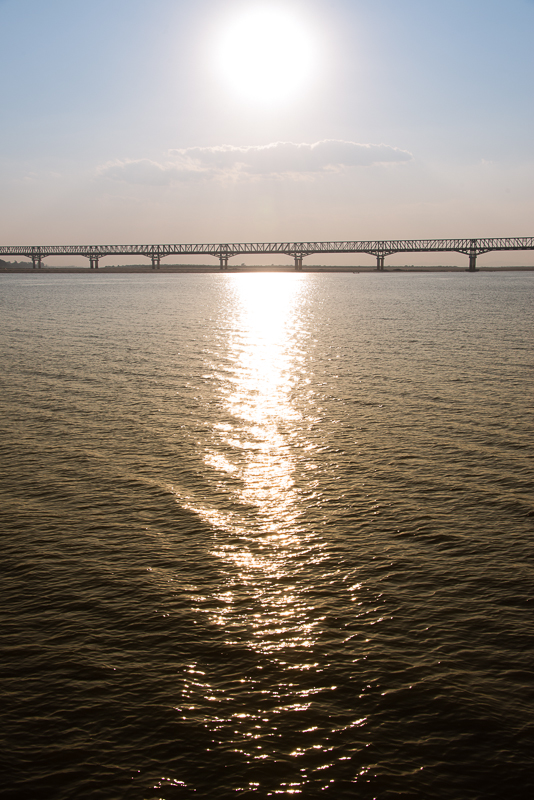 Late in the afternoon we passed under a big road bridge, which I knew from the guidebook was 16 miles by road from Bagan, but that was still just over an hour later until we actually got there, just after sunset.