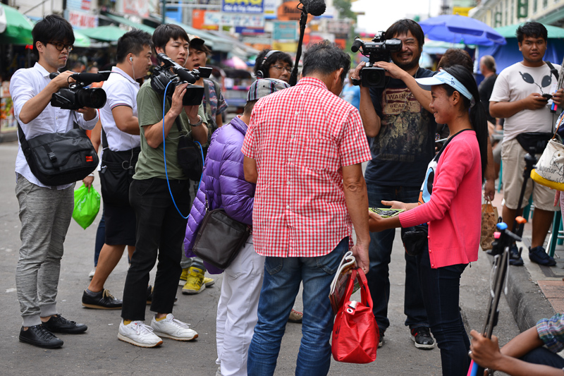 I don’t know if they were filming for a travel show or just a personal extravaganza but there were a couple of elderly Japanese being followed by several cameras and sound recordist. One of them was tempted by the fried scorpions but took a small mouthful and spat it out !