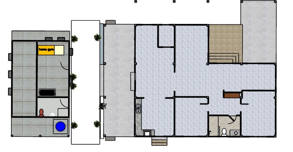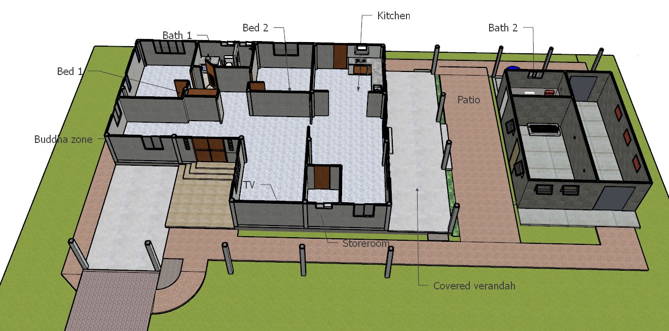 2 bedrooms, 2 bathroom, decent sized kitchen, a Buddha zone for the wife, small home gym and workshop/tool storage for me.