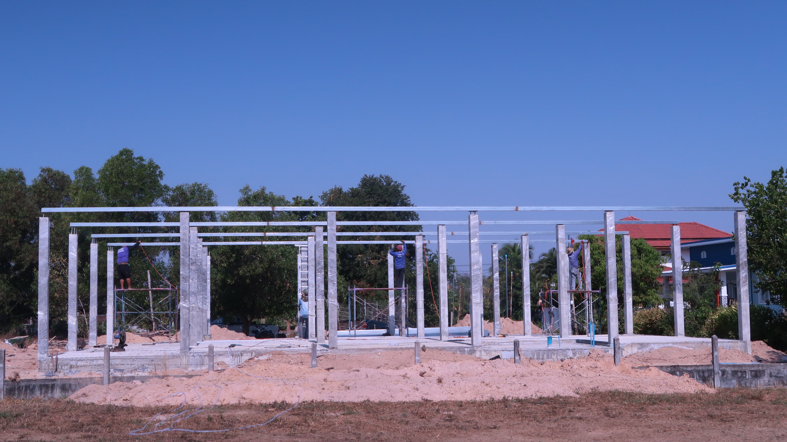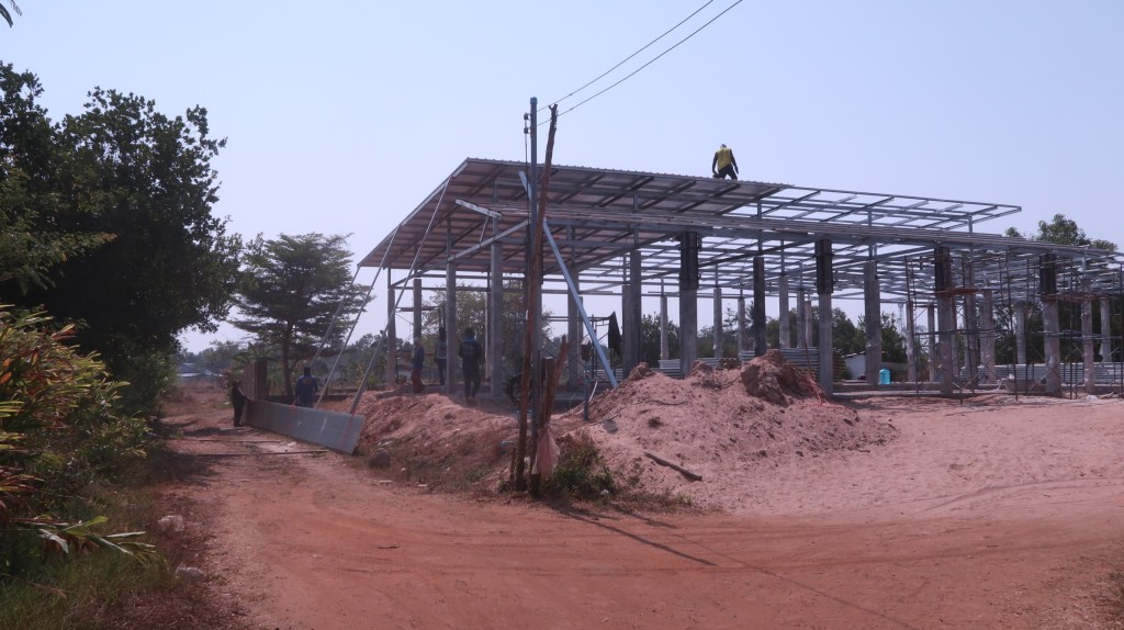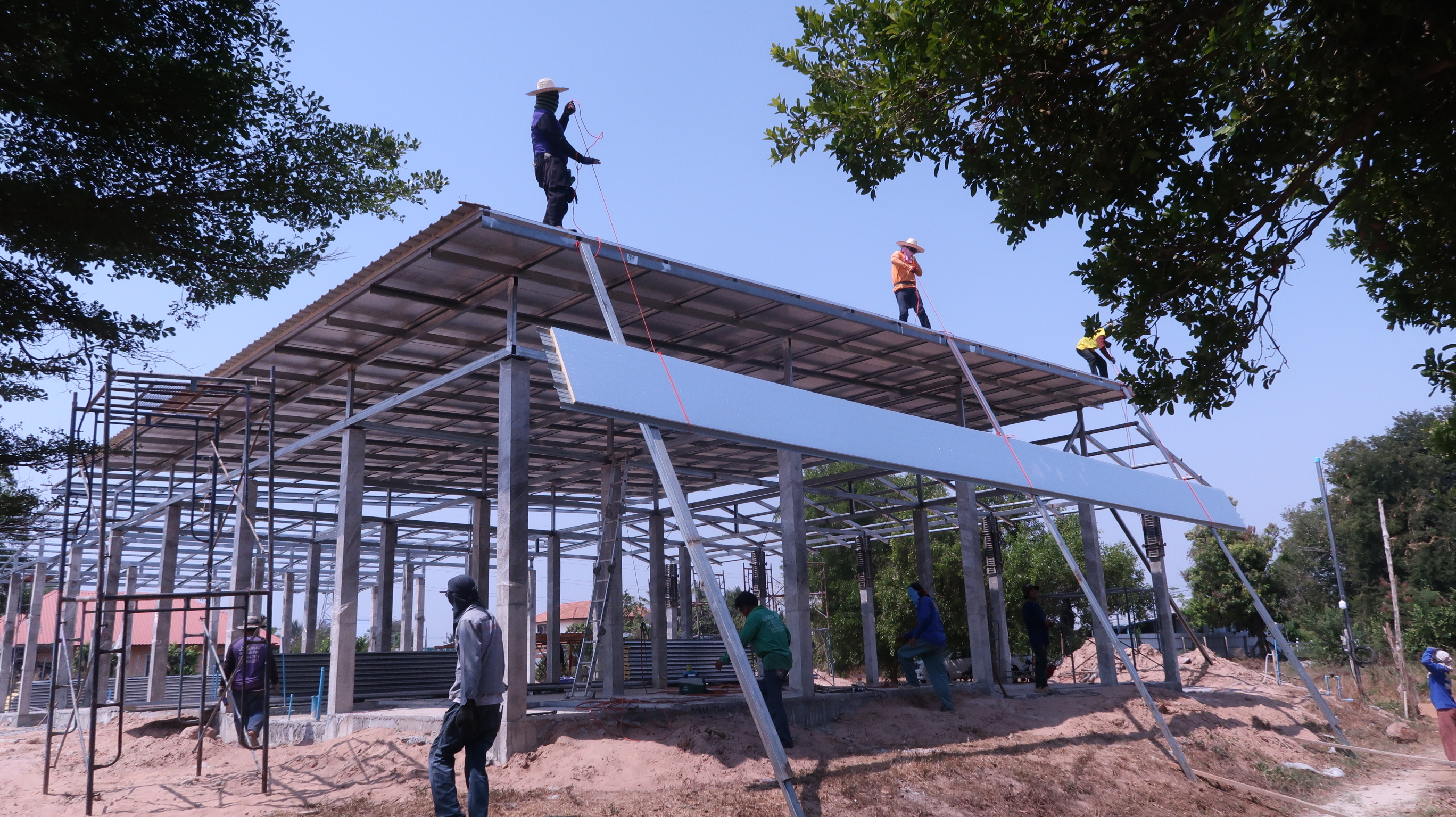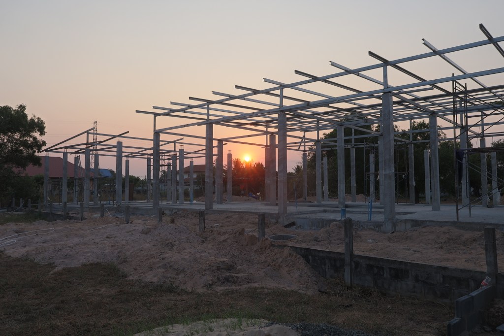 We had chosen a greyish colour, backed with 35mm PU foam for insulation. Personally I would have liked a lighter colour but “happy wife, happy life” and let her choose this medium grey. The foam insulation seems to be doing it’s job as it was a lot cooler under the roof. I climbed the scaffolding to have a look at the roof fittings, the roof surface was too hot to touch but the underside was barely warm. The workers thought it was ok under the roof as they quickly moved their hammocks and chairs under it!