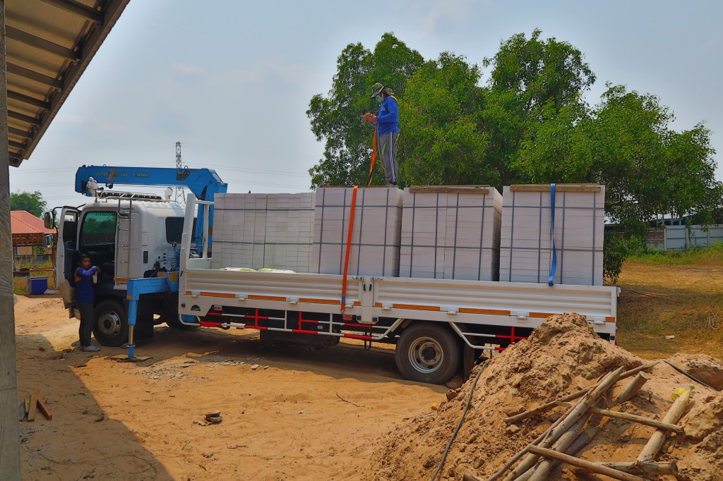 1600 AAC blocks arrived, and none of the building crew here to sign for them. A phone call to the boss brought him here, it’s his job to verify the order is correct and intact, not ours. Will the wall crew be here tomorrow ? Somehow I doubt it, as the roofers are still working overhead, but we will see.