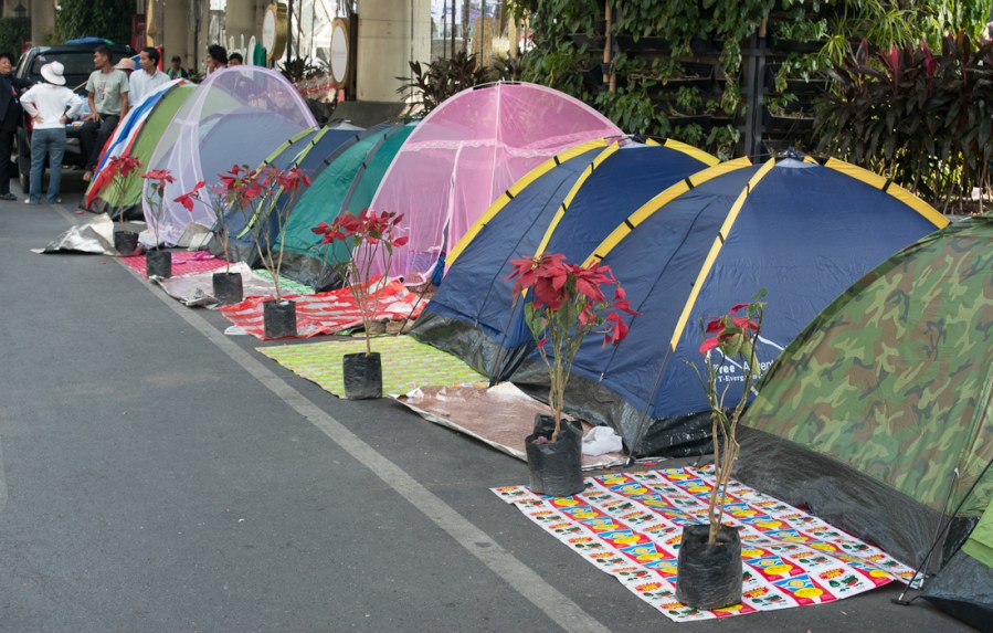 Urban camping ..tents set up on the main road, complete with landscaping !